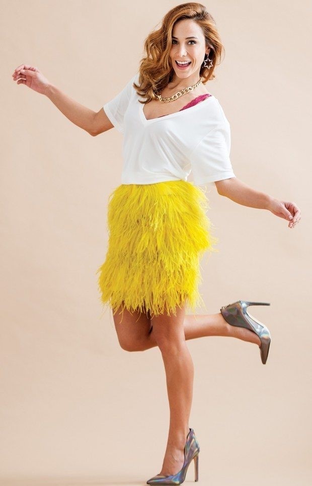 İşte Burçin Terzioğlu'da bu tüylerden yapılan eteği kullanıyor. Giyip poz veriyor.